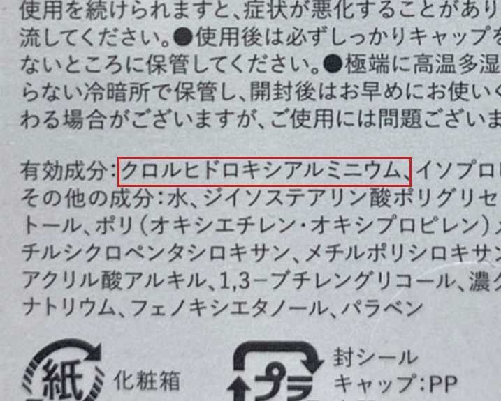 一方、サラフィネの制汗成分はクロルヒドロキシアルミニウム。